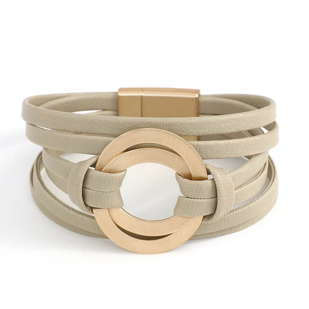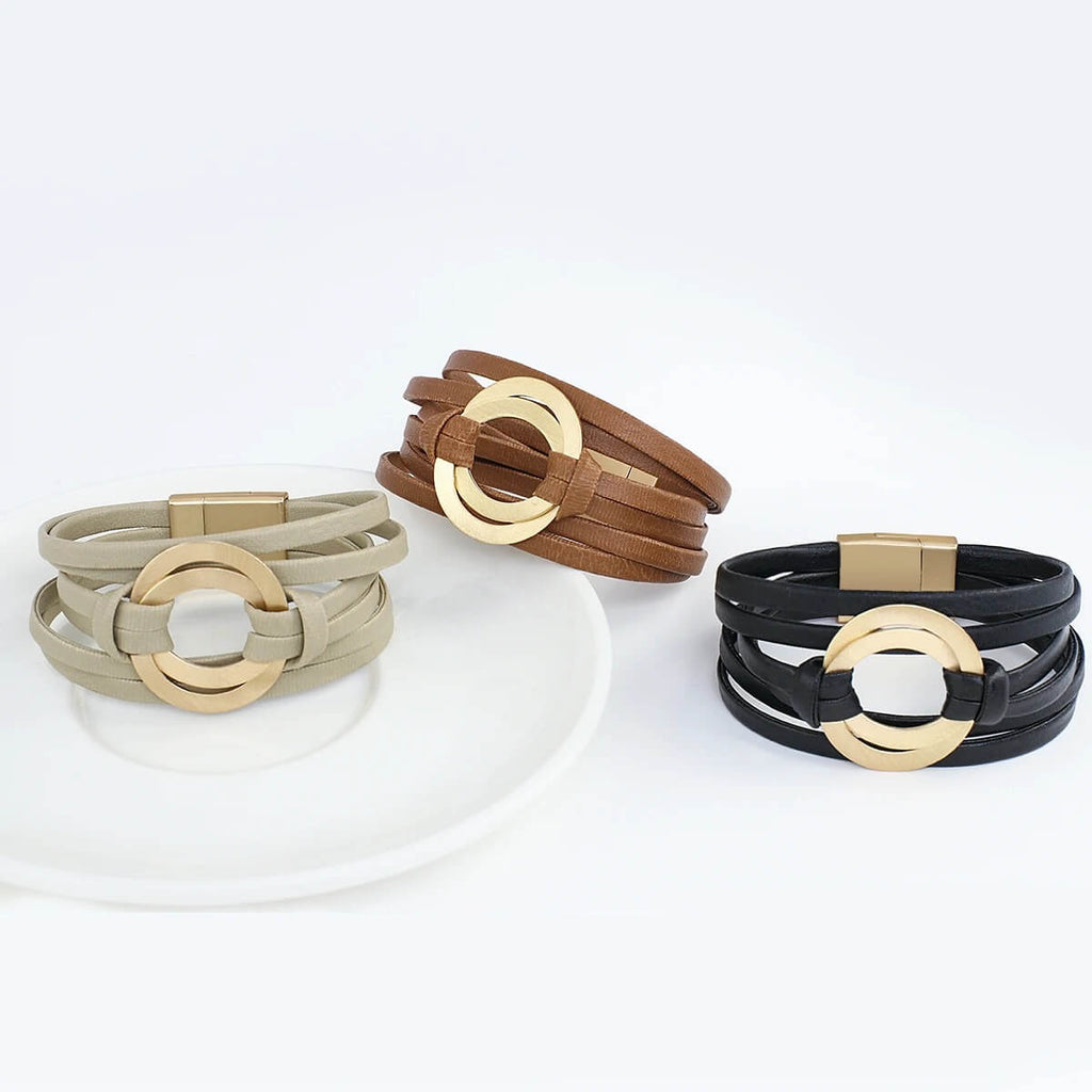 Seu design envoltório com círculos ocos dourados combina facilmente com qualquer estilo — do casual ao elegante — tornando-se não apenas um acessório, mas um verdadeiro aliado no seu dia a dia. Seja para um encontro descontraído ou um evento sofisticado, esta pulseira será sempre apreciada.
