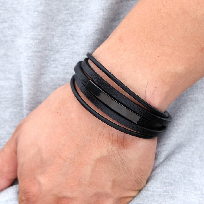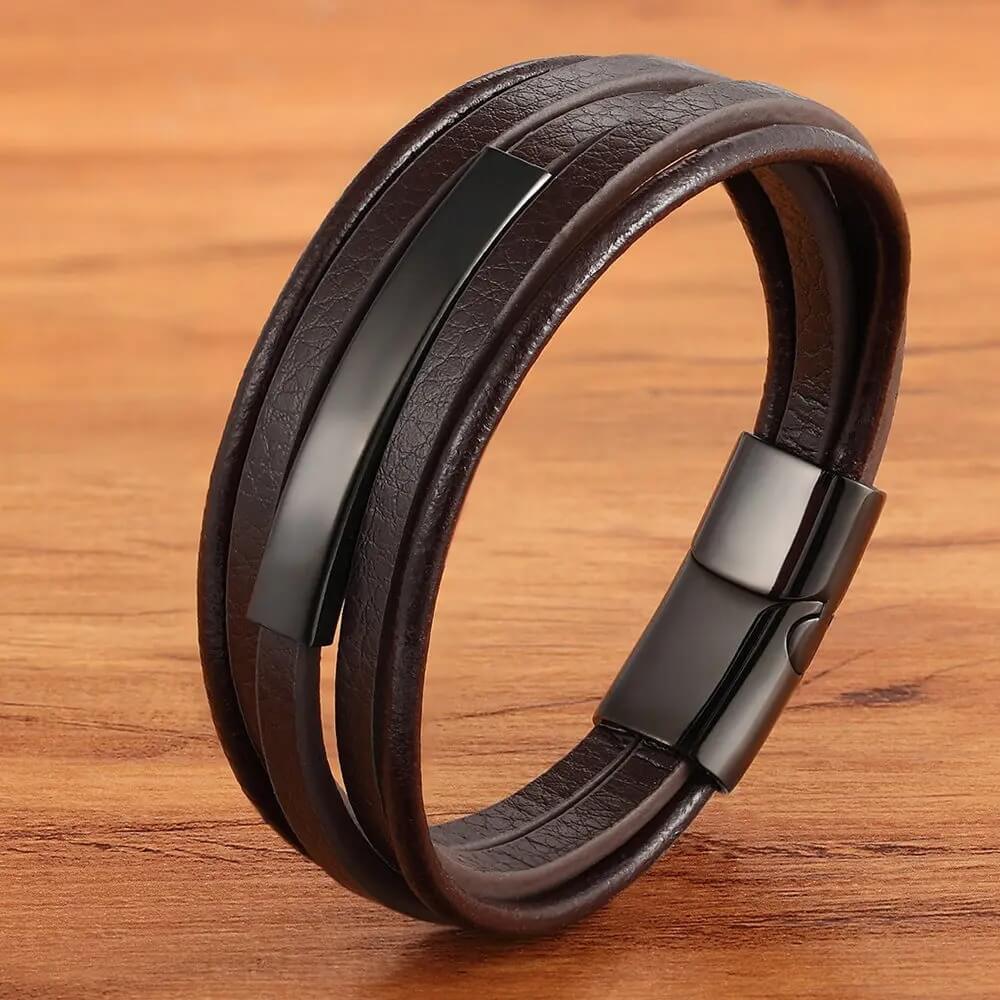 Pulseira Eixo de Aço | Couro Multicamadas & Estilo Minimalista