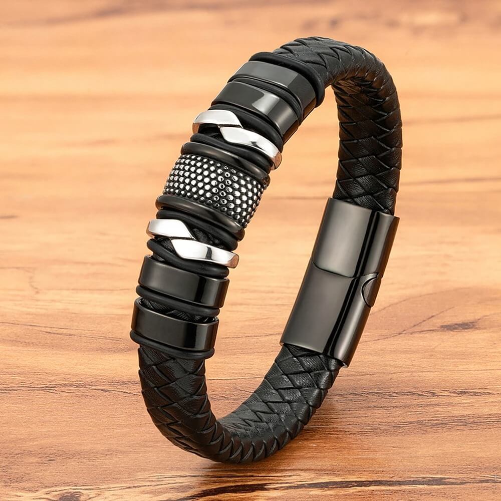 O couro trançado traz textura e resistência, enquanto o brilho do aço adiciona intensidade e sofisticação. Já o fecho seguro garante praticidade e confiança para acompanhar todos os momentos do dia.