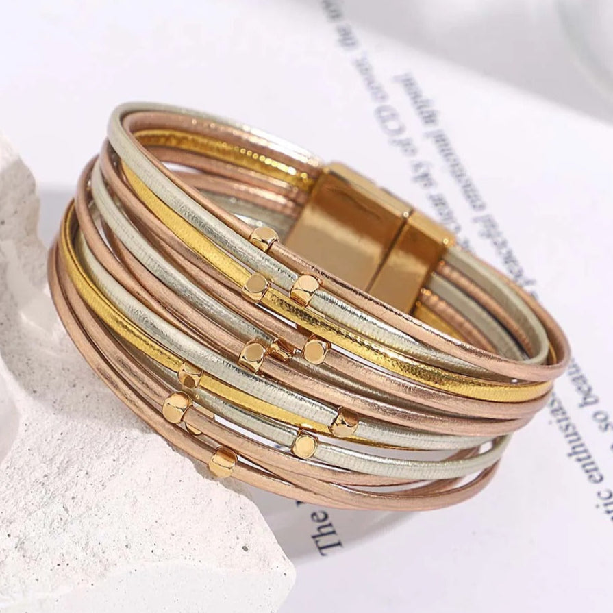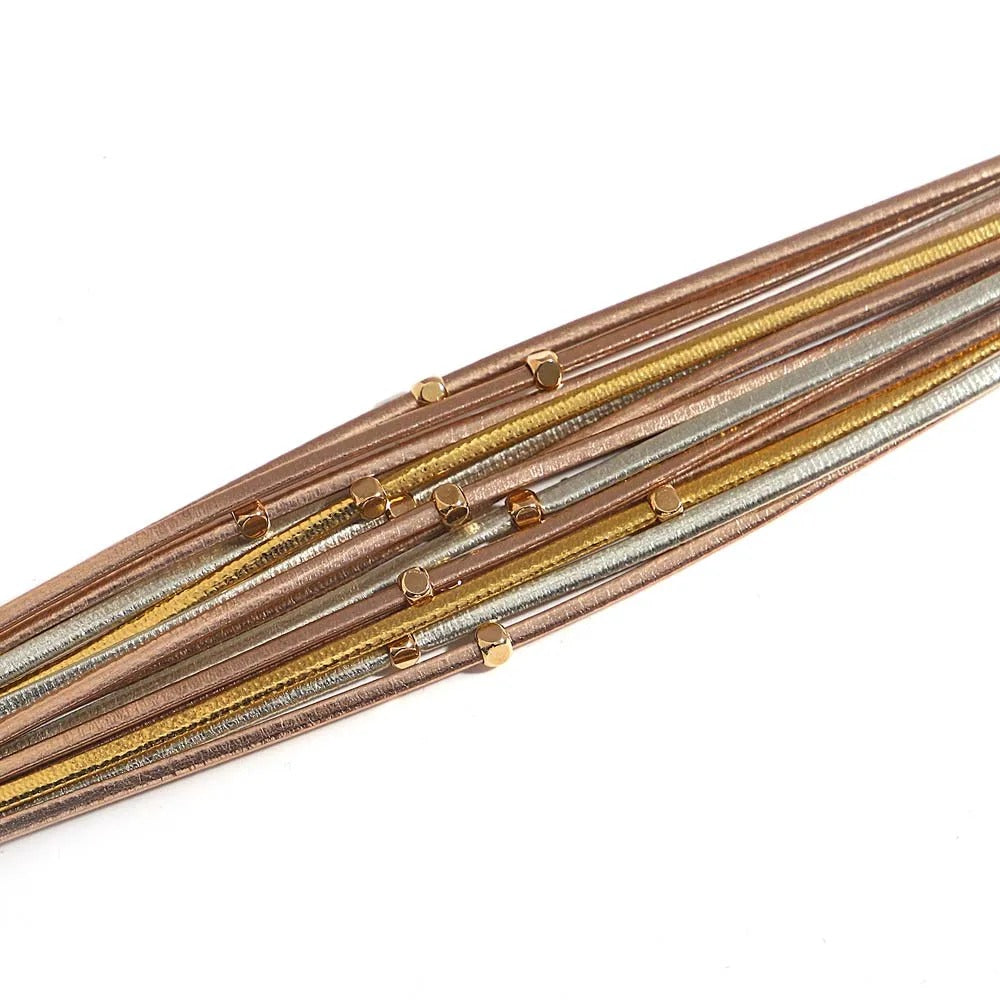A Pulseira Fios Nobres é mais que um acessório — é um testemunho da joalheria artesanal. Meticulosamente trabalhada, combina tiras de couro premium com delicadas contas douradas, criando um contraste harmônico que capta olhares e valoriza qualquer produção.